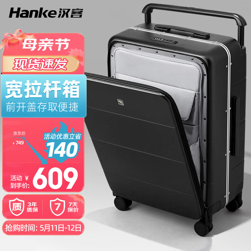 汉客宽拉杆行李箱铝框男前开盖拉杆箱旅行箱大容量24英寸墨玉黑密码箱价格:749.00元!