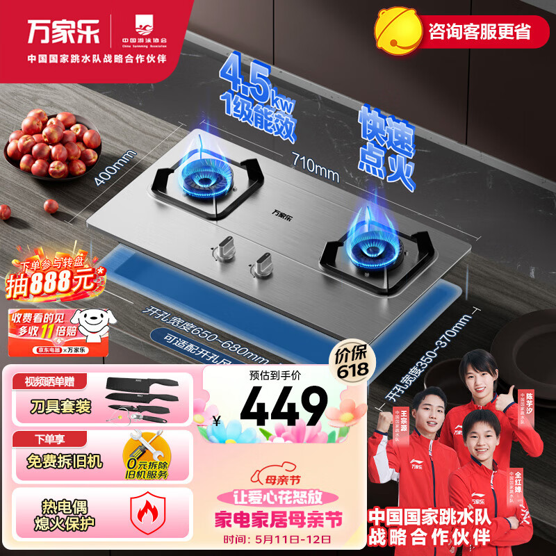 万家乐燃气灶 4.5kW大火力不锈钢天然气灶 台嵌两用双灶猛火灶 一级能效 家用燃气灶具JZT-KA032天然气价格:549.00元!