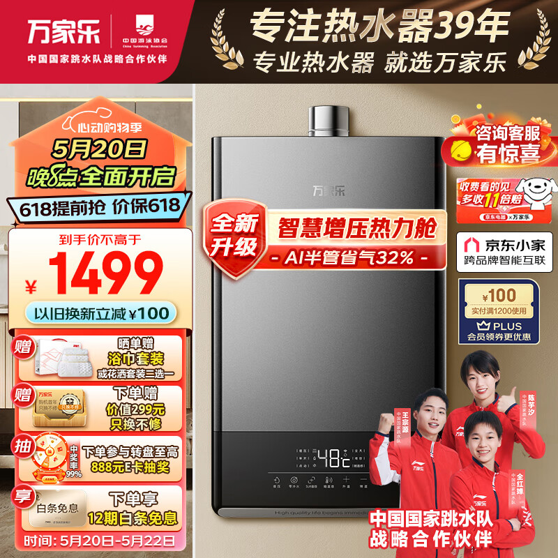 万家乐16升零冷水燃气热水器水气双伺服恒温APP智控智慧热力舱降噪天然气增压JSQ30-16DL1S京东小家价格:3499.00元!
