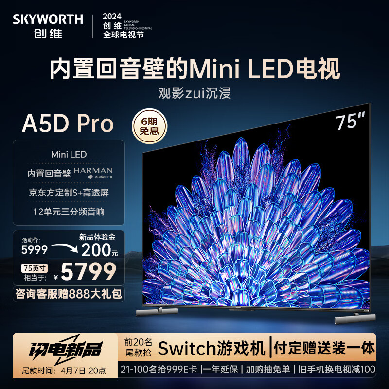 创维电视75A5D Pro 75英寸内置回音壁mini led电视机定制S+高透屏4K超薄护眼平板巨幕大屏游戏电视价格:5999.00元!