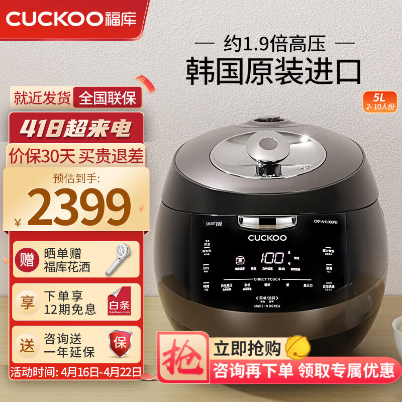 福库(CUCKOO)电饭煲家用5-8个人 韩国原装进口5升大容量高压电饭锅智能语音预约定时 多功能IH高压钻石聚能内胆 AH1080FD 新包装 (2-10人) 5L价格:3499.00元!