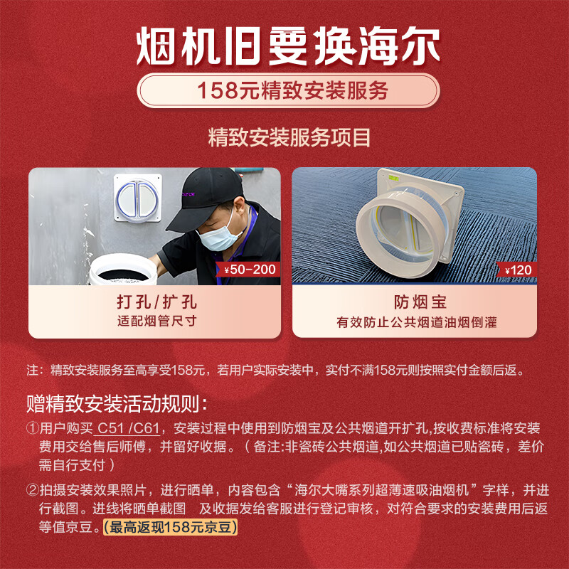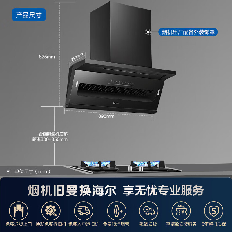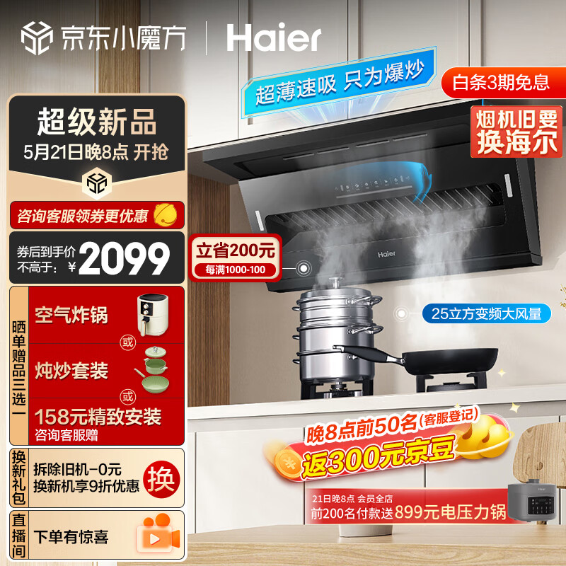 海尔(Haier)抽油烟机 顶侧双吸 7字型家用排烟机 25m3/min大吸力 齐平橱柜 挥手智控 自动清洗排吸烟机C61价格:2299.00元!