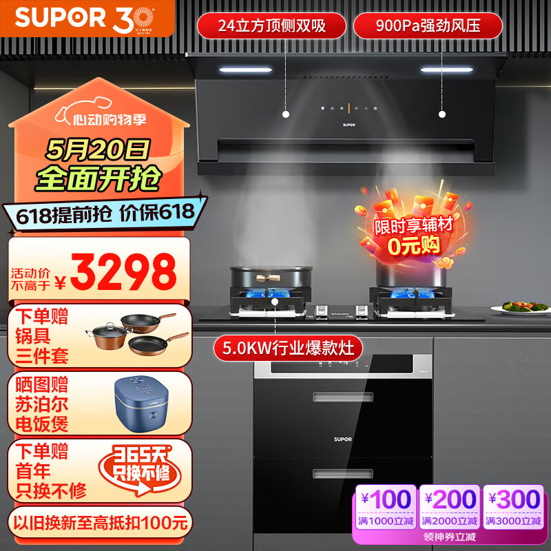 苏泊尔(SUPOR)抽油烟机 顶侧双吸油烟机灶具消毒柜套装 24立方家用厨房烟灶消三件套 DL36+Q5天然气+508价格:3598.00元!