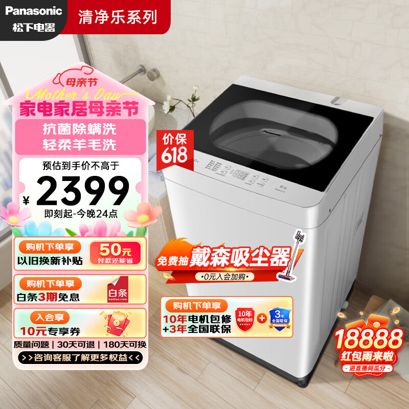 松下(Panasonic)波轮洗衣机全自动 清净乐系列 10公斤大容量 抗菌除螨 羽绒羊毛洗 桶自洁耐脏 XQB100-Q17CR价格:2399.00元!