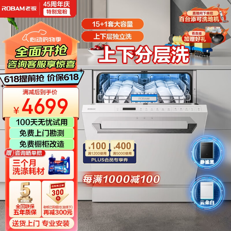 老板(Robam)F80D白15+1套大容量嵌入式去重油污洗碗机热风烘干消毒168h长效存储一体机家用独立式分层洗价格:5199.00元!