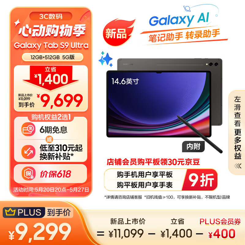 三星(SAMSUNG)S9 Ultra Al智享学习办公平板电脑14.6英寸 120Hz 12G+512GB 5G含Spen AI平板 云影灰价格:9699.00元!