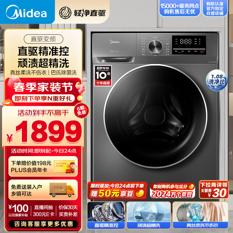 美的(Midea)滚筒洗衣机全自动 轻净直驱系列 直驱变频 顽渍超精洗 1.08洗净比 全域除菌螨 10公斤 MG100V630DE价格:1899.00元!
