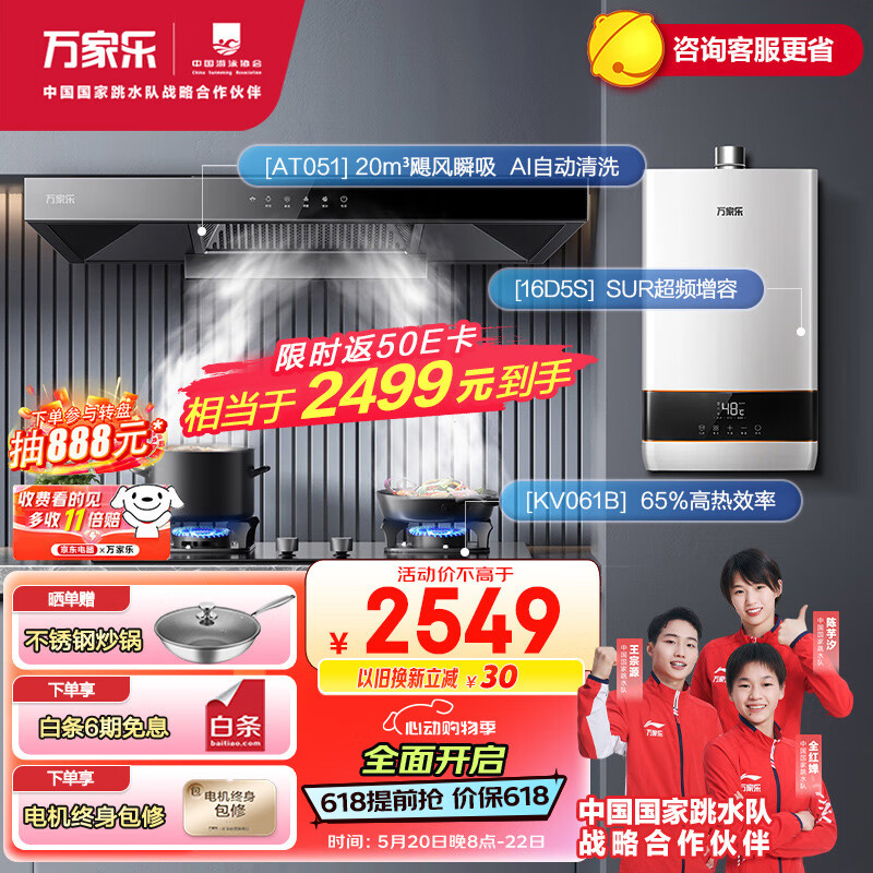 万家乐烟灶热三件套装 20立方挥手烟灶16L增容四季随温感热水器多件套装AT051+KV061B+16D5S天然气价格:2749.00元!