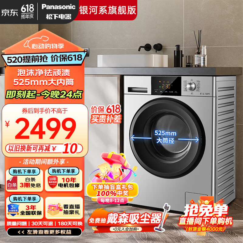 松下(Panasonic)滚筒洗衣机全自动 超薄全嵌 【银河系旗舰版】10公斤 泡沫净祛渍 户外服洗 XQG100-3N1S价格:2699.00元!