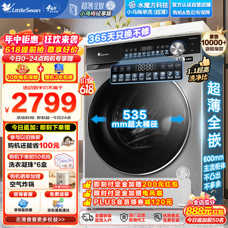 小天鹅(LittleSwan)洗衣机全自动家用10公斤滚筒水魔方小乌梅轻享版超薄全嵌智能投放大筒径10公斤SC18价格:3099.00元!