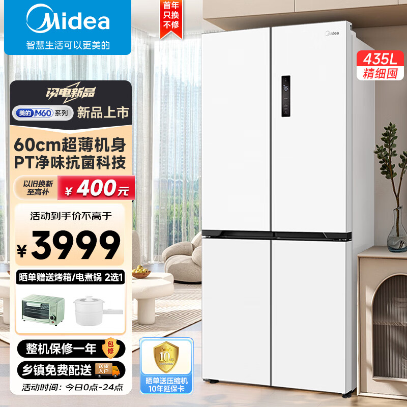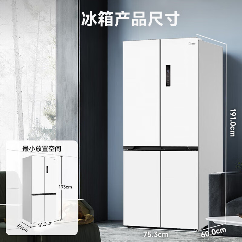 美的(Midea)456十字对开门四开门冰箱 超薄嵌入式家用大容量智能电冰箱M60超薄系列 MR-456WSPZE极地白价格:4399.00元!