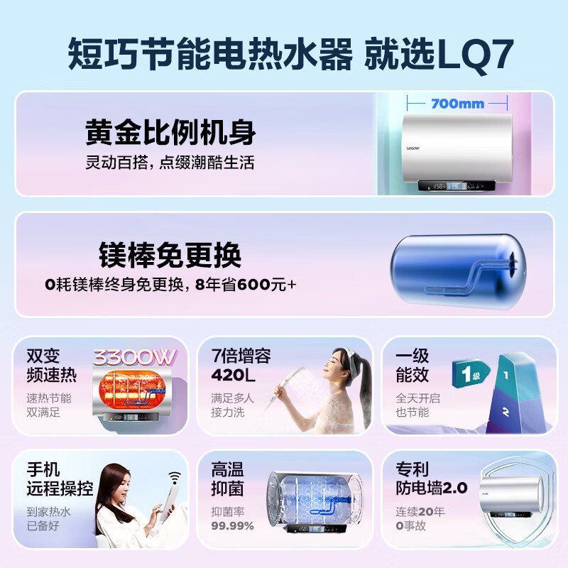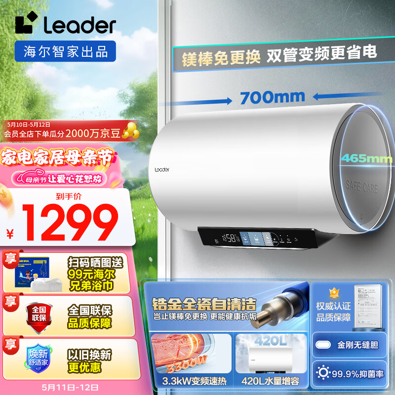 Leader海尔智家出品【金刚无缝胆】60升电热水器3300W大功率速热变频健康免换镁棒 LEC6002H-LQ7K白U1价格:1399.00元!