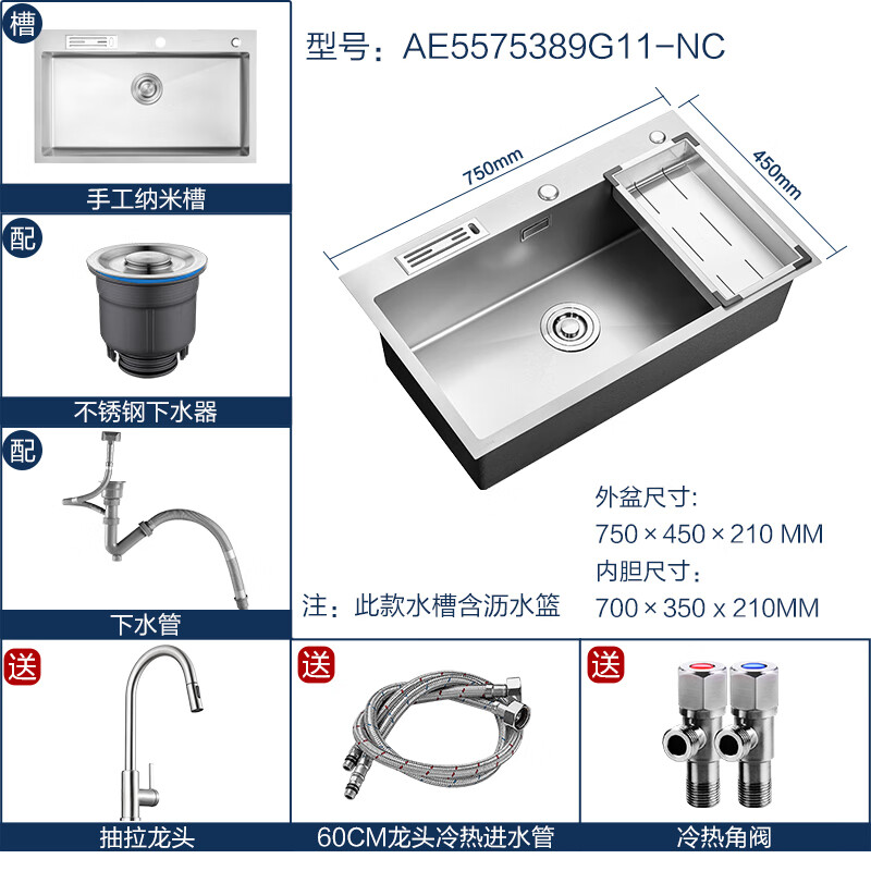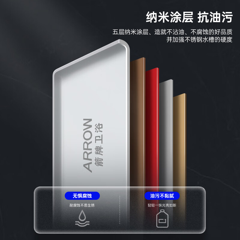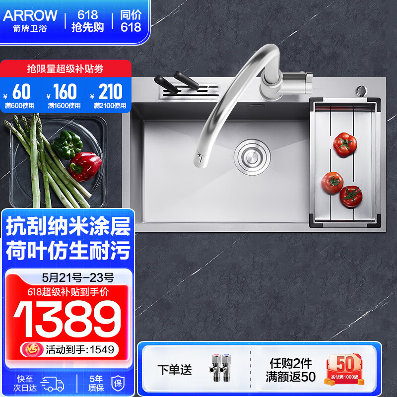 箭牌(ARROW)纳米手工水槽大单槽304不锈钢加厚厨房洗菜池洗碗盆一体盆 75*45银纳米槽(含沥水篮+龙头)价格:1727.00元!
