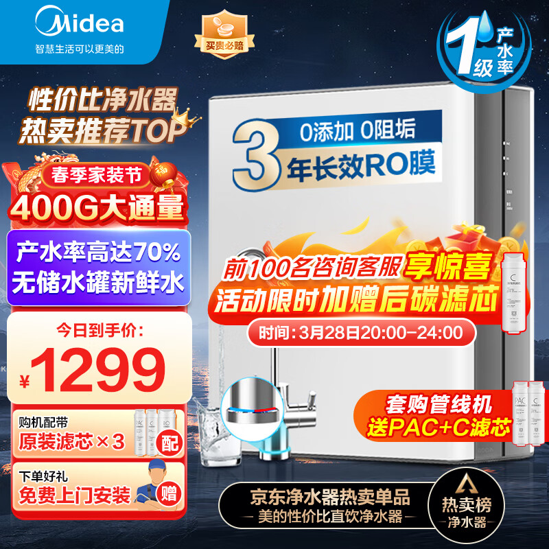 美的(Midea)出品净水器家用厨下式全屋自来水过滤器RO反渗透母婴直饮机华凌净水机 【人气推荐】400G大通量价格:1999.00元!