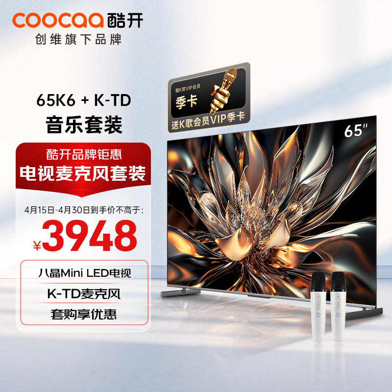 酷开创维65K6 65英寸八晶Mini LED电视机+K-TD麦克风套装 K歌电视 家庭KTV无线唱歌 双支麦克风价格:3948.00元!