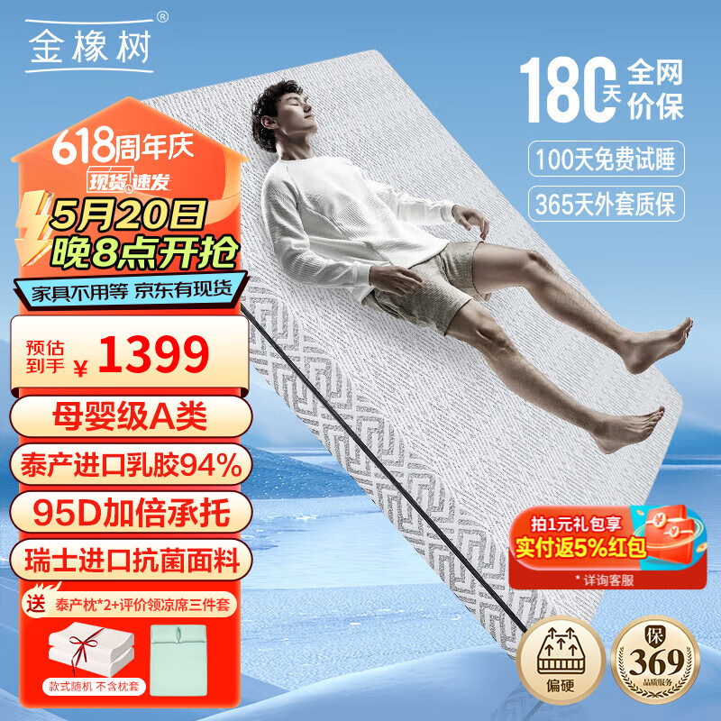 金橡树尊享95D加硬轻奢泰国整芯原产进口乳胶床垫1.5米*2米 94%世爵PLUS价格:2299.00元!