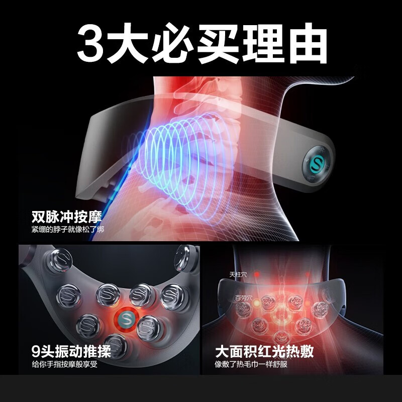 2、SKG之前老款基本都是脉冲的,这次加了按摩和脉冲一起,真心赞!坐办公室的、玩儿手机的,谁家还没个颈椎病患者了!试戴了几天还挺好,可以关闭按摩只脉冲、也可以关闭脉冲只按摩;热敷比较适合吹空调着凉之后,很多夏天落枕都是吹凉了......反正现在家里排着队用,非常值!