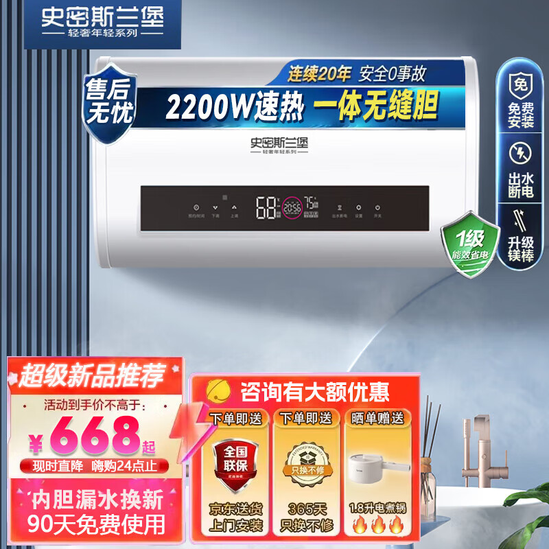 史密斯兰堡储水式电热水器家用 50升扁桶即开即热洗澡双胆双倍防护 2200W一级能效经济节能包安装DSZF-T06Y50价格:668.00元!