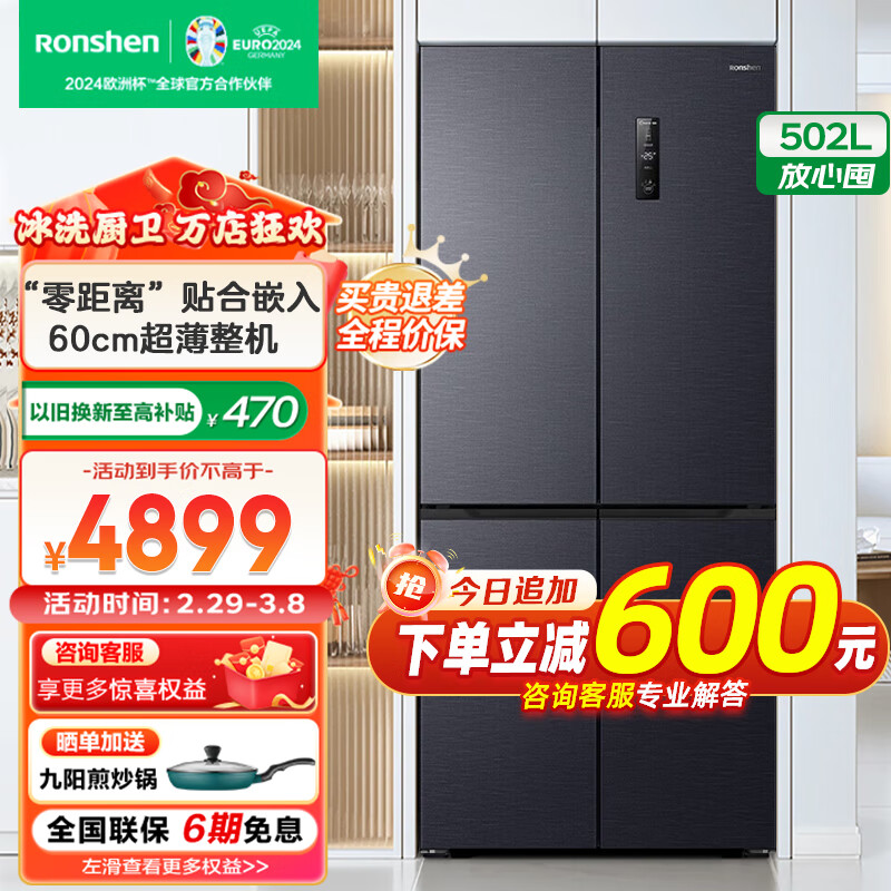 容声(Ronshen)502L十字对开四开门多门超薄零距离嵌入式一级变频底部散热家用无霜超大容量冰箱BCD-502WD1FPQ价格:5499.00元!