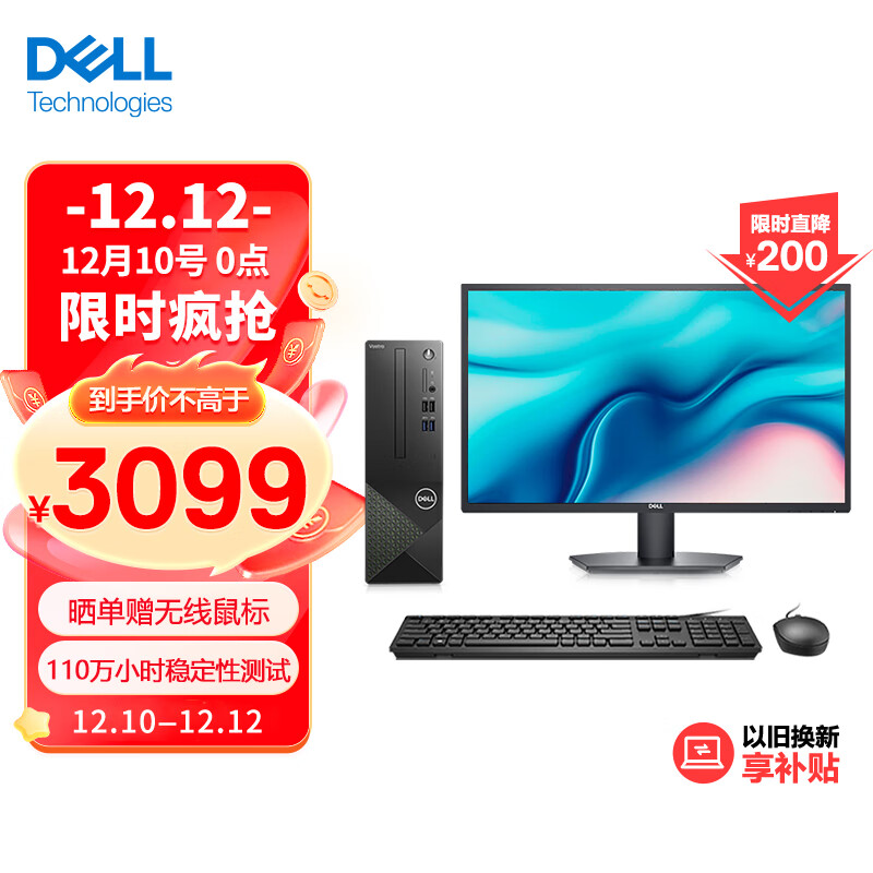 戴尔(Dell)成就3710 台式电脑主机 (12代i3-12100 8G 512GSSD WiFi Win11三年上门)27英寸大屏显示器价格:3099.00元!