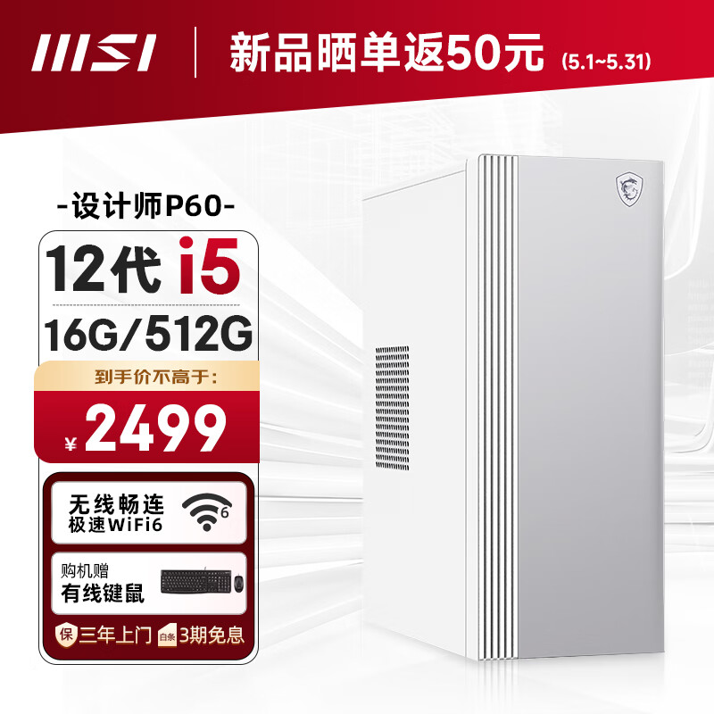 微星 设计师P60办公台式电脑(12代i5-12450H 16G 512GSSD 商务键鼠WiFi6)商用全套diy组装整机单主机价格:2599.00元!