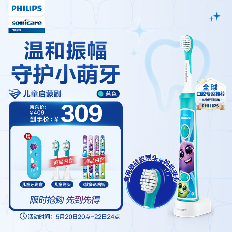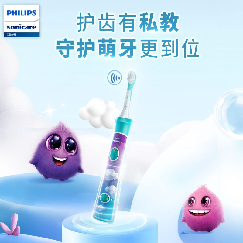 飞利浦(PHILIPS)儿童电动牙刷男女生蓝牙版 适用4-6-12岁 2种模式自带2支迷你刷头+8款贴纸 蓝色HX6322/04价格:359.00元!