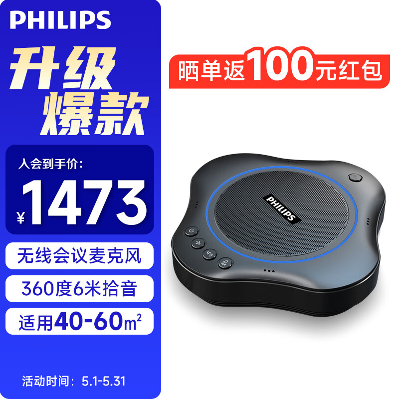 飞利浦全向麦克风 6米拾音半径会议麦克风 无线音箱桌面扬声器适用40-60㎡无线带电池0500PLUS价格:1453.00元!