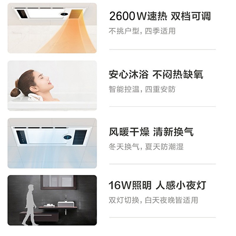 4、家里大部分都小家电都是在京东入手的。装修的时候看了不少浴霸。这款升温效果快。。之前的故障,联系售后安排师傅上门检查。后面直接换机。速度很快。