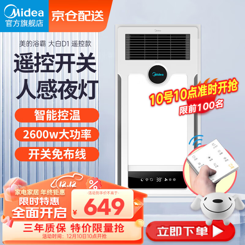 美的(Midea)风暖浴霸集成吊顶双核遥控浴室卫生间排气扇照明一体暖风机小夜灯价格:699.00元!