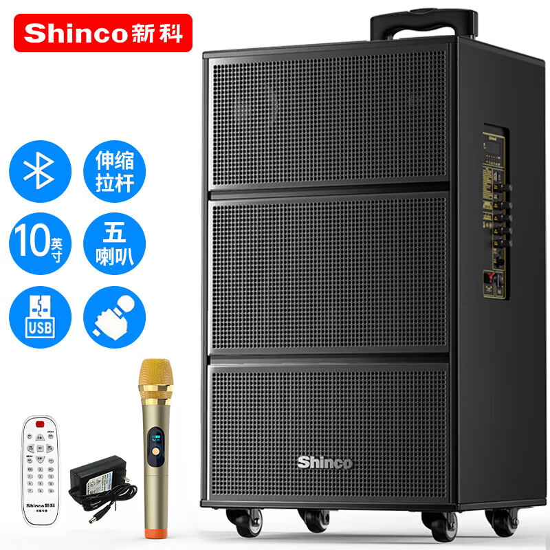 新科(Shinco)V50广场舞音响户外大音量拉杆音箱五喇叭木质箱体大功率家用K歌移动摆摊低音炮10吋单咪价格:838.00元!