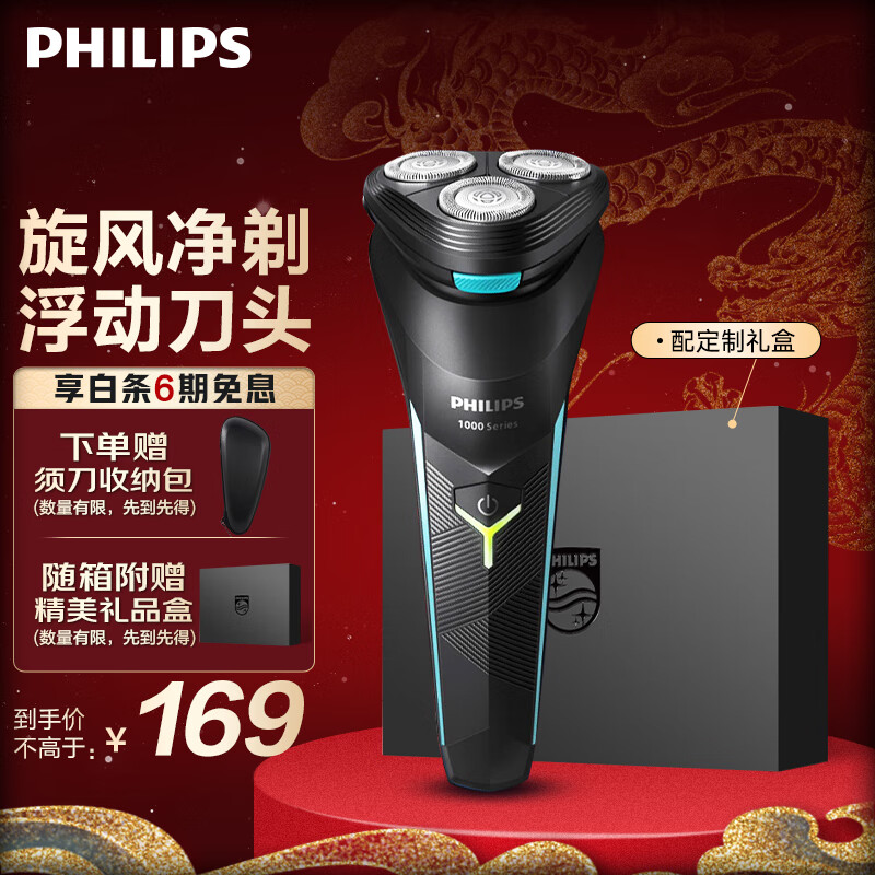 飞利浦(PHILIPS)剃须刀电动 全身水洗 1小时快充 便携式刮胡刀 男士生日送男友送父亲 【炫酷机身】S1000 礼盒装价格:219.00元!