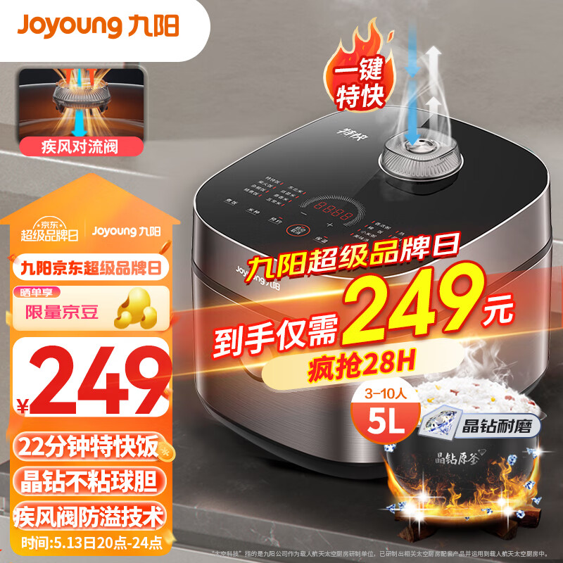 九阳(Joyoung)家用5L大容量3~10人多功能电饭煲电饭锅晶钻球胆22分钟特快饭顶置操控面板不粘饭煲5升50FY661价格:259.00元!
