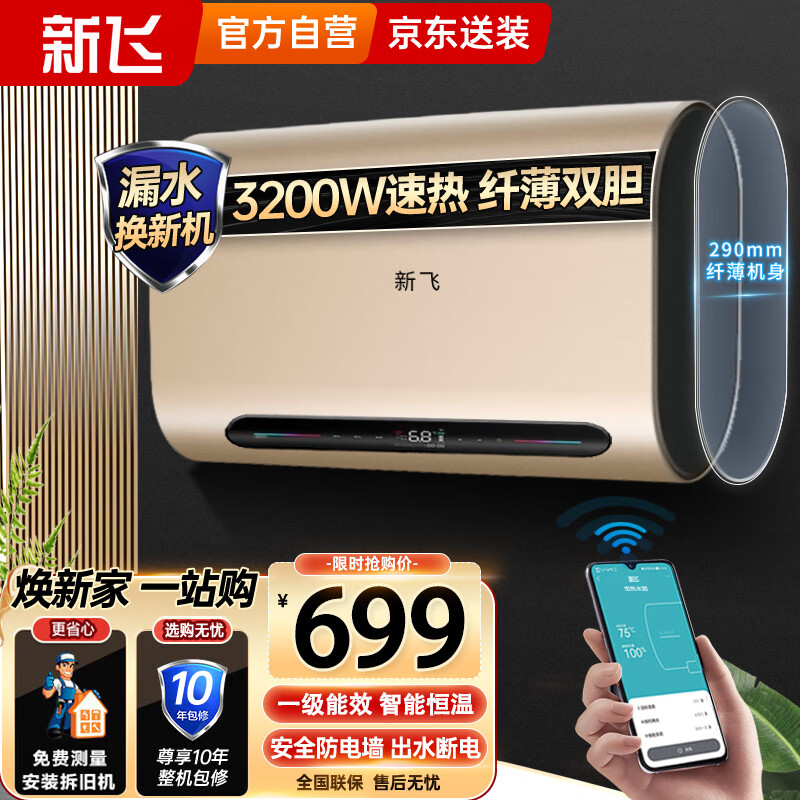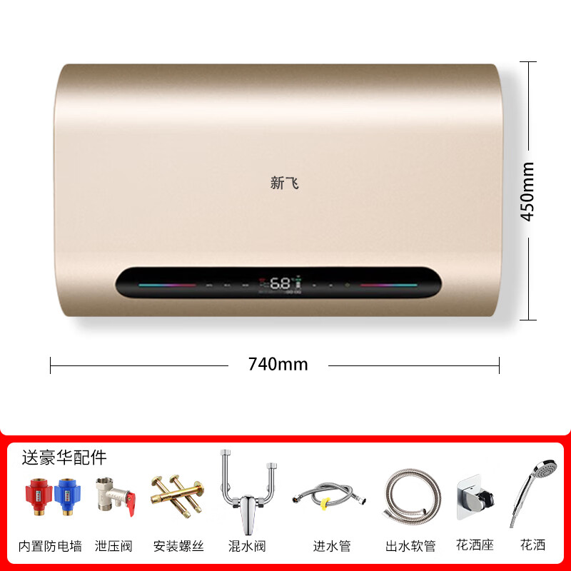 新飞电热水器家用储水式手机遥控预约50升一级能效3200W节能速热出水断电卫生间淋浴DSZF-B301-50L耀金价格:699.00元!