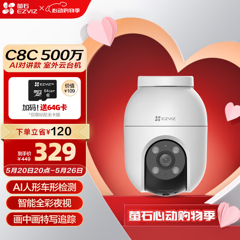 萤石 C8C 500万摄像头 无线WiFi 室外双云台360° 防水防尘监控 手机远程 人形检测 全彩夜视价格:328.90元!