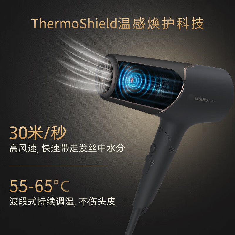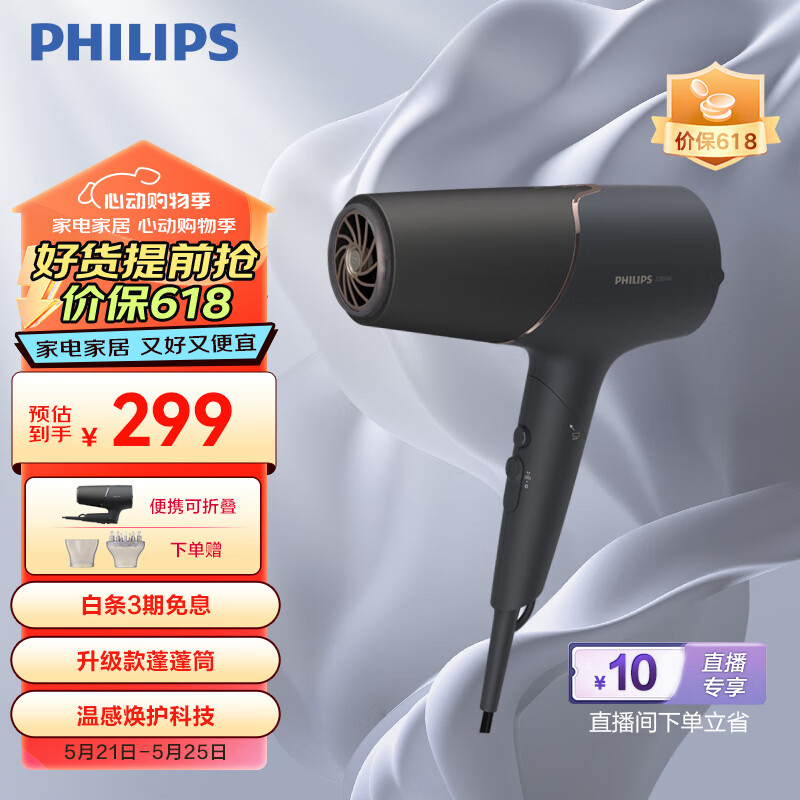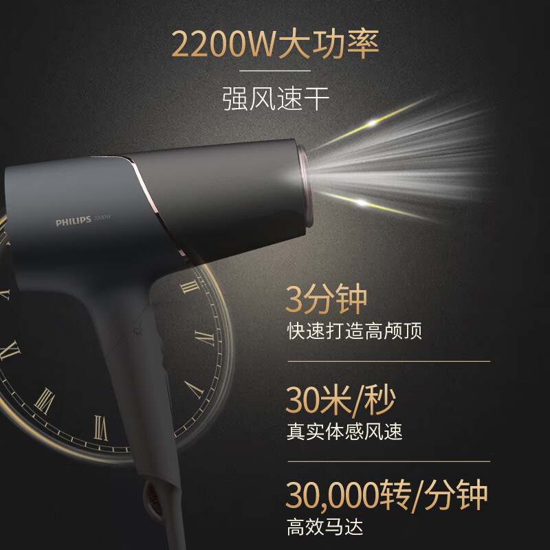 飞利浦(PHILIPS)电吹风机 5系pro 蓬蓬筒 温感焕护4千万负离子 矿物质锌离子 大功率大风速干 黑色价格:299.00元!