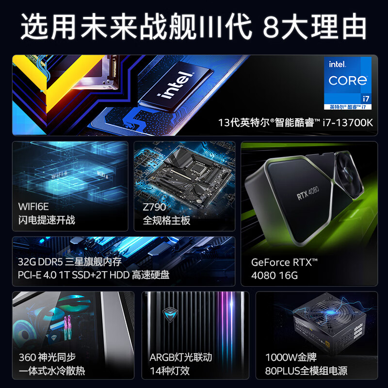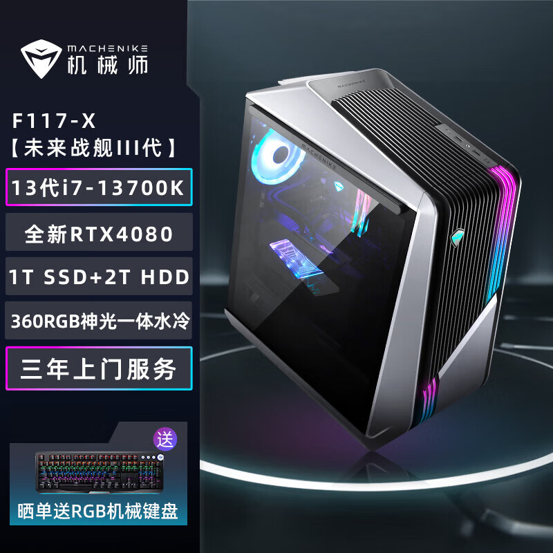 机械师(MACHENIKE)未来战舰 游戏台式机电竞电脑主机(13代i7-13700K 32G DDR5 1TSSD+2T RTX4080)360水冷价格:16482.50元!