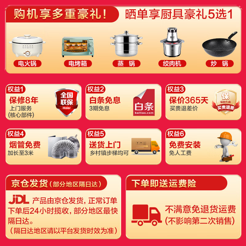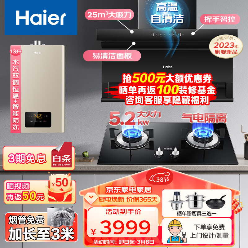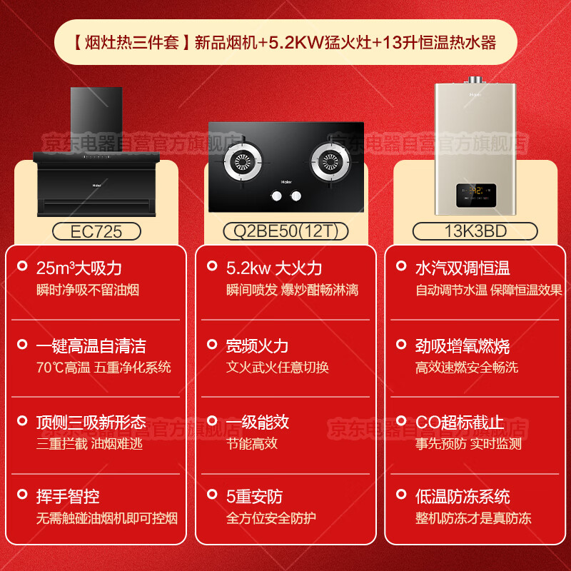 海尔(Haier)抽油烟机燃气灶套装25m3挥手智控顶侧双吸EC725+5.2KW灶Q2BE50+13升热水器13K3BD厨房三件套[家电]价格:4499.00元!