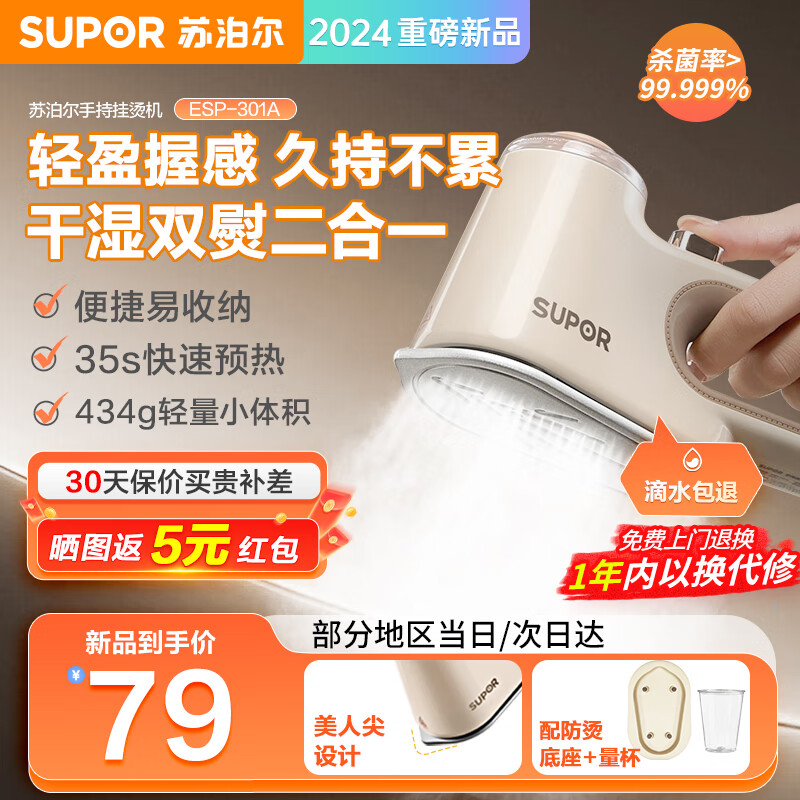 苏泊尔(SUPOR)挂烫机蒸汽电熨斗手持熨烫家用小型轻巧便携式大蒸汽喷气式熨衣服迷你家电旅行800W宿舍 ESP-301A价格:109.00元!