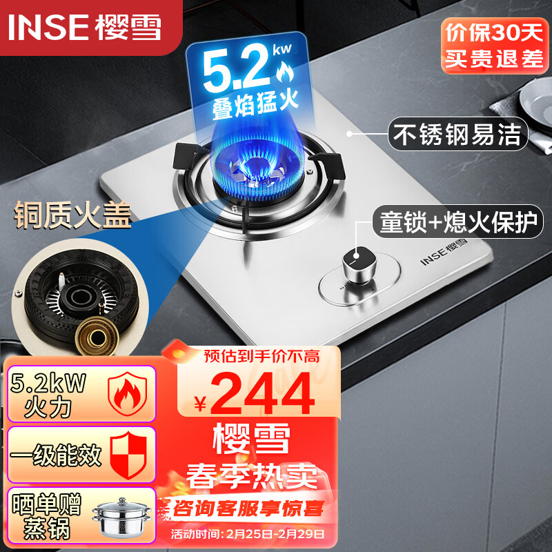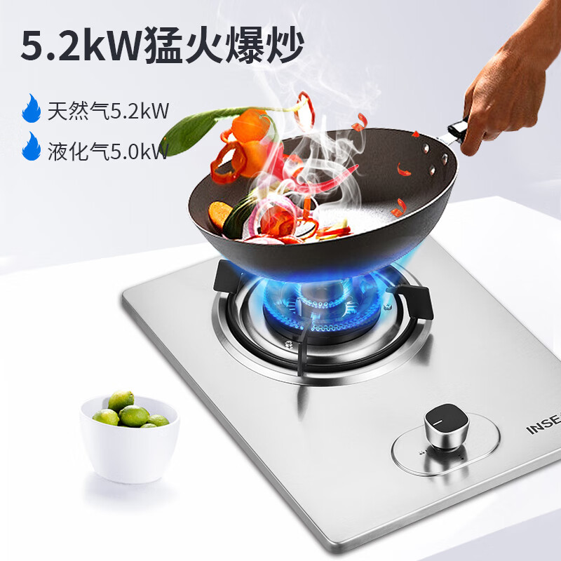 樱雪(INSE)燃气灶单灶 5.2kW猛火台嵌两用煤气灶 真铜火盖 家用节能单眼灶 不锈钢面板 Q2211(G)天然气价格:244.00元!