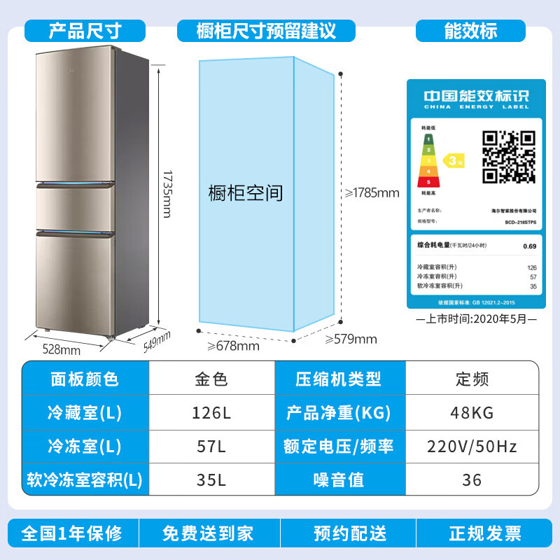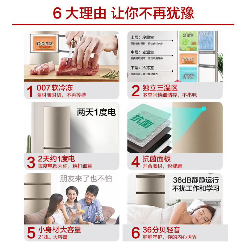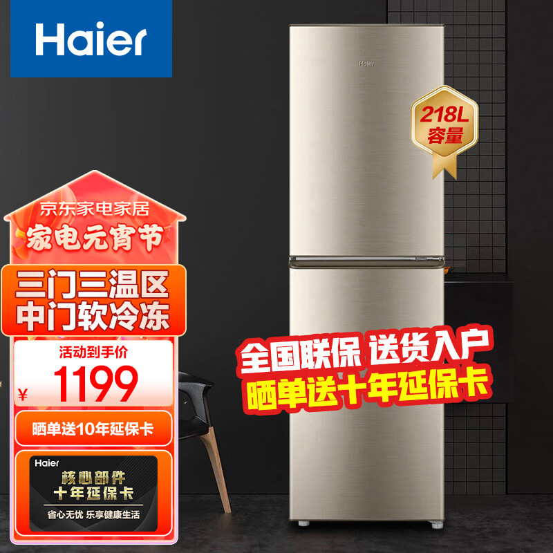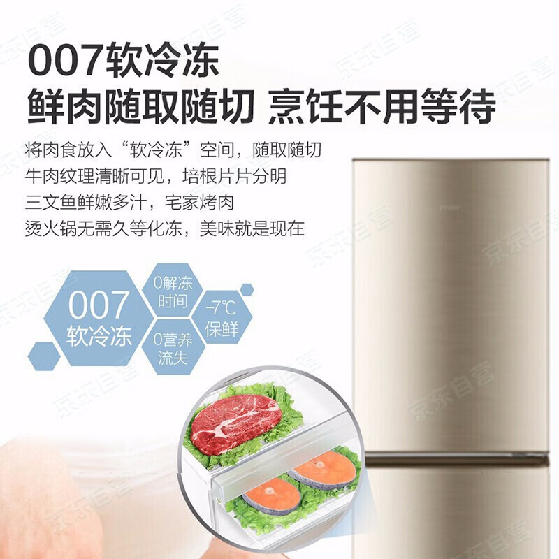 海尔冰箱 218升 三门冰箱 租房家用 节能保鲜 低温补偿 007中门软冷冻小冰箱 BCD-218STPS[家电]价格:1199.00元!