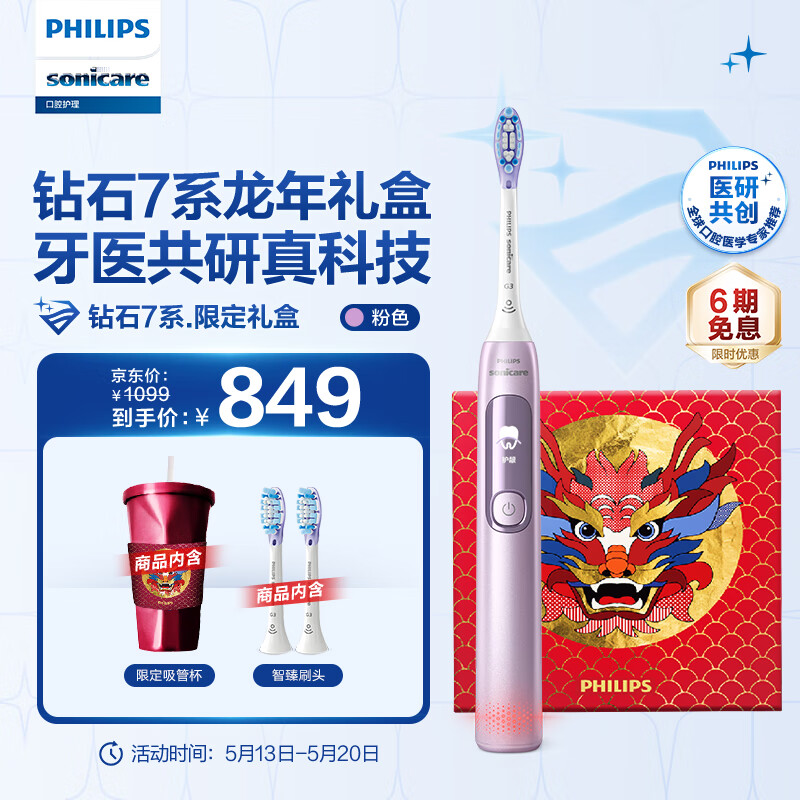飞利浦(PHILIPS)电动牙刷成人 520情侣送男/女友 母亲节礼物 5种模式 2支护龈刷头钻石7系樱花粉 龙年限定礼盒价格:1049.00元!