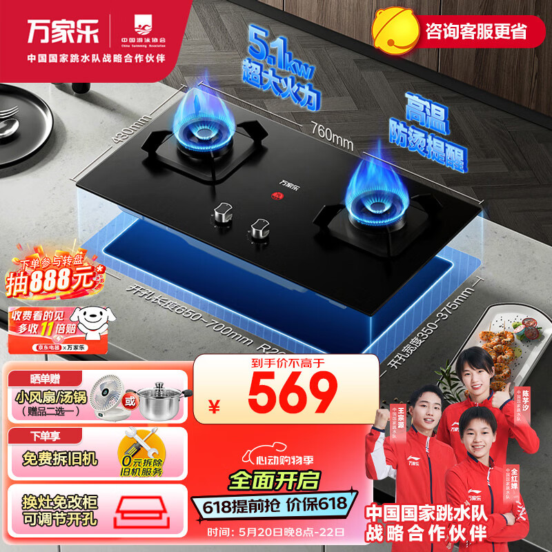 万家乐燃气灶5.1kw火力 家用嵌入式台式两用燃气灶 钢化玻璃面板 高温防烫提醒 全进风天然气灶JZT-TAC5价格:569.00元!