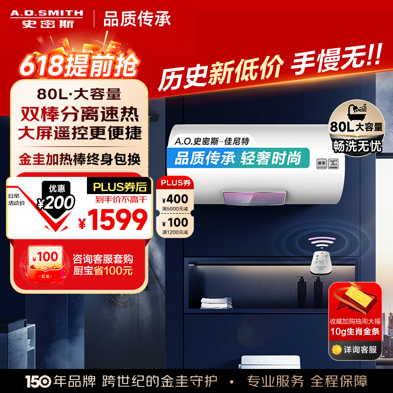 史密斯(A.O.SMITH)佳尼特80升电热水器 金圭内胆包8年 双棒分离速热 可遥控大屏 储水式 CTE-80TT 一级能效价格:2798.00元!