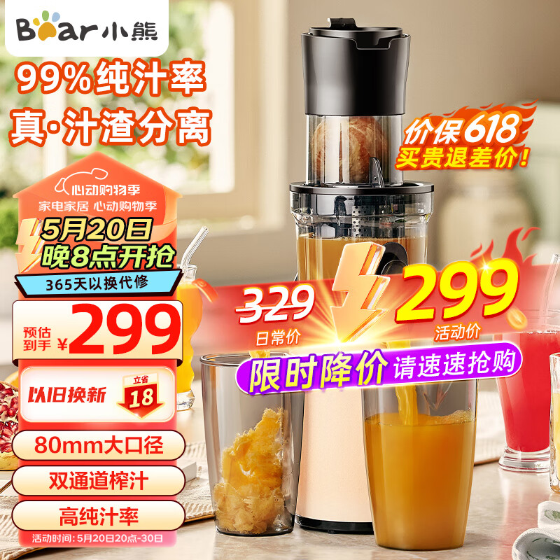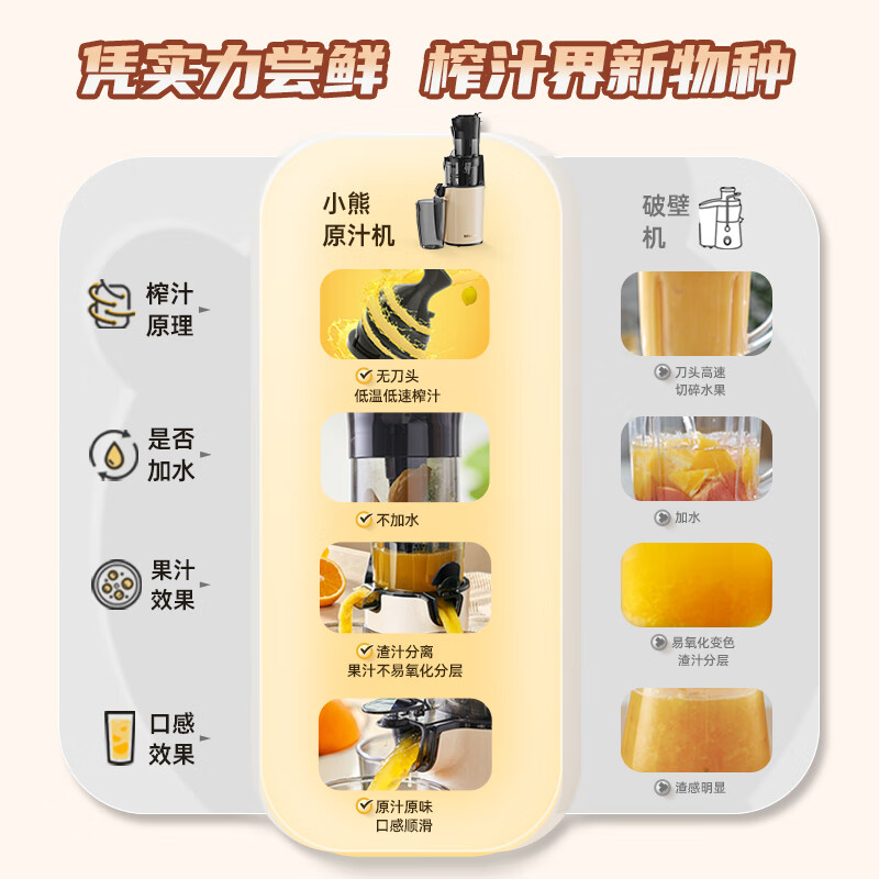 小熊(Bear)原汁机 家用小型榨汁机汁渣分离 全自动多功能冷压炸果蔬机 果汁机 YZJ-C02S5价格:299.00元!