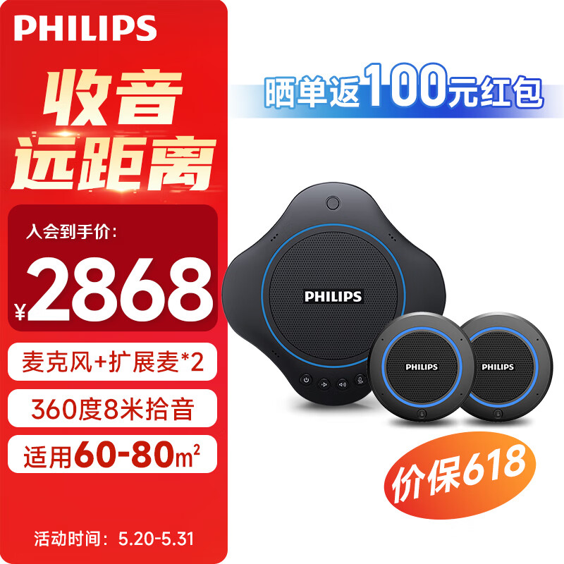 飞利浦视频会议麦克风套装/适用60㎡ 无线全向麦克风0500plus+USB免驱扩展拾音麦0400*2价格:2868.00元!