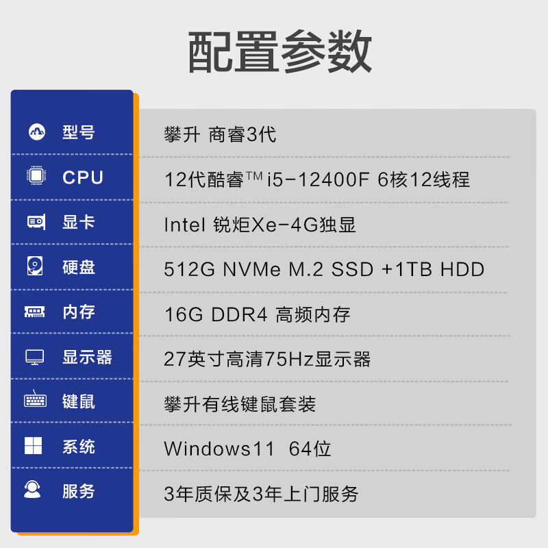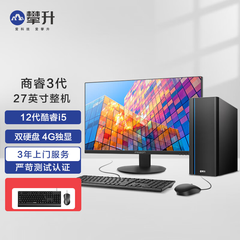 攀升 商睿3 酷睿i5办公商用家用台式电脑主机(12代i5-12400F 16G 512G+1T 4G独显WiFi)27英寸价格:3549.00元!