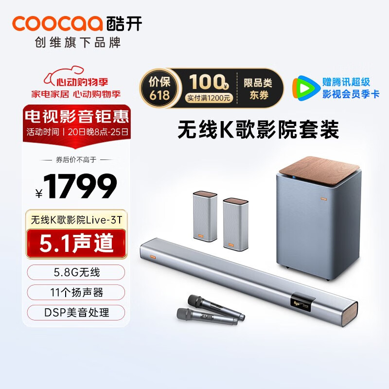 酷开(coocaa)创维出品Live-3T 家庭KTV 电视音响 回音壁 家庭影院5.1 无线低音炮 3D环绕家用K歌卡拉OK音箱套装价格:1899.00元!