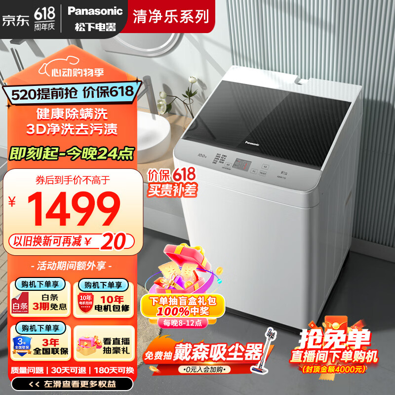 松下(Panasonic)全自动波轮洗衣机10公斤 节能省水除螨洗 大容量智能洗涤桶洗净快速洗XQB100-T1721价格:1699.00元!