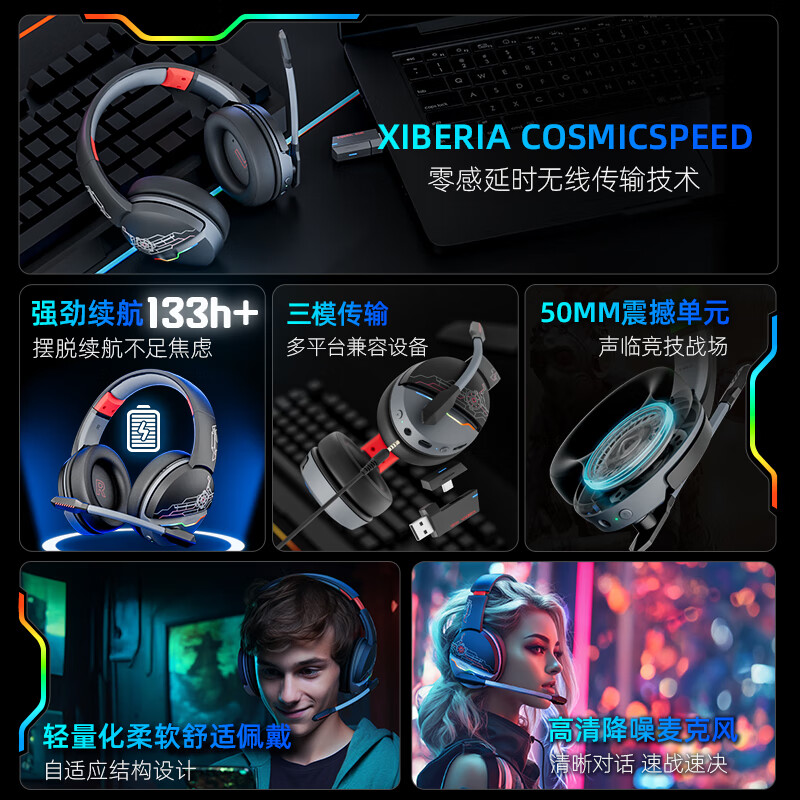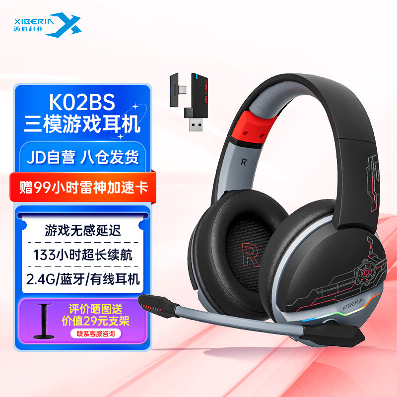 西伯利亚 K02BS2.4G真无线蓝牙游戏耳机头戴式手机低延迟电竞专用三模耳机台式电脑耳机麦克风二合一黑红色价格:199.00元!