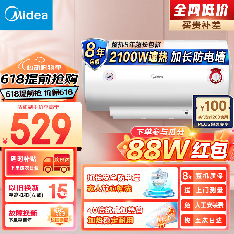 美的(Midea)热水器2100W速热耐用小体积 双重杀菌 升级加长防电墙全屋漏电预警40升电热水器F40-21WA1价格:529.00元!